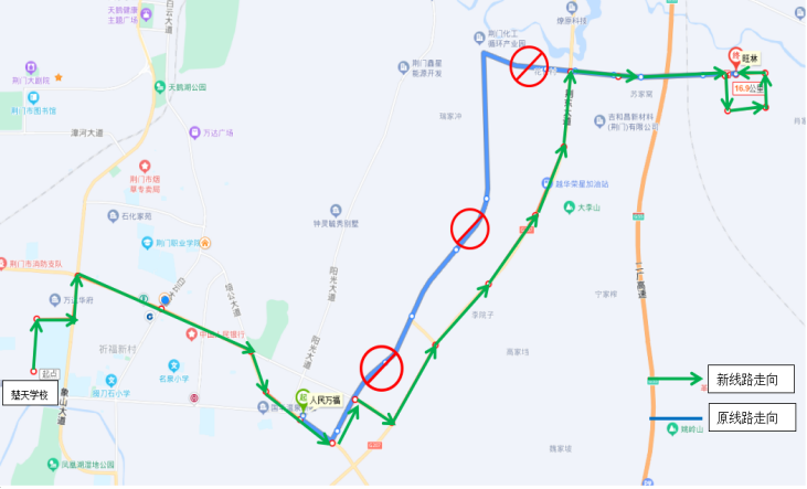 一.優(yōu)化調整33路公交線路走向 ◆首末站:楚天學校—旺林(小康南路北) ◆首末班時間:6:50—17:45 ◆線路走向:響嶺路—運動公園路—象山大道—深圳大道—培公大道—荊和大道—深圳大道—荊東大道—興化三路—格林北路—興化四路—小康南路 ◆??空军c:楚天學校、雙喜街辦、運動公園路、萬達廣場、掇刀檢察院、掇刀法院、掇刀公安分局、南城明珠、中國人民銀行、市氣象局、襄荊高速、雙泉社區(qū)、人民萬福商貿城、人民一品花園、虎頭山、殯儀館、馮廟村、固潤科技、東方雨虹、圣通石化、荊東消防、荊東大道興化五路口、潤都制藥、興化三路西、興化三路中、興化三路盈德氣體、紐蘇萊、旺林、興化四路、小康南路北。 ◆取消原33路途經(jīng)荊和大道等路段站點:荊和大道南、陽光五路、陽光四路、陽光三路、化工產業(yè)園行政大樓。 二.優(yōu)化調整69路公交發(fā)班時間 ◆調整前 園博園東門發(fā)班時間:6:40、7:40、15:30、16:30、17:15 玲瓏輪胎發(fā)班時間:7:30、8:30、16:30、17:30、18:00 ◆調整后 園博園東門發(fā)班時間:6:40、7:20、15:30、16:30 玲瓏輪胎發(fā)班時間:7:30、8:20、12:20、16:20、17:30